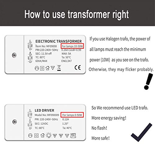 AC/DC 12 V: gebruik beter een geschikte LED transformator. Als je een halogeentrafo wilt aansluiten, let er dan op dat de hele wand van deze ledlamp het laagste vermogen van je aangesloten transformator kan bereiken. Anders flikkeren de lampen.