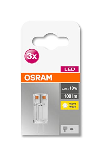 Specification: OSRAM BASE LED-lamp, PIN-lamp met G4-fitting, 0,90 W, vervanging voor conventionele 10 W lampen, warmwit (2700 K), 3 stuks